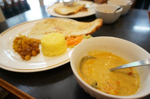 お好みのカレー、ナンとライス、サブジ2種のセットです。 この日はジンガカレーというエビのカレーを選びました。マイルドで美味しい!