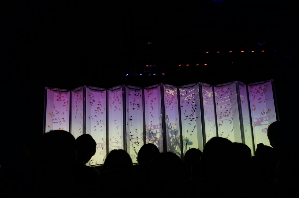 たくさんの金魚が泳ぐ屏風型の水槽の背景にプロジェクションマッピングで12ヶ月の四季の風景がきれいに映し出されます。