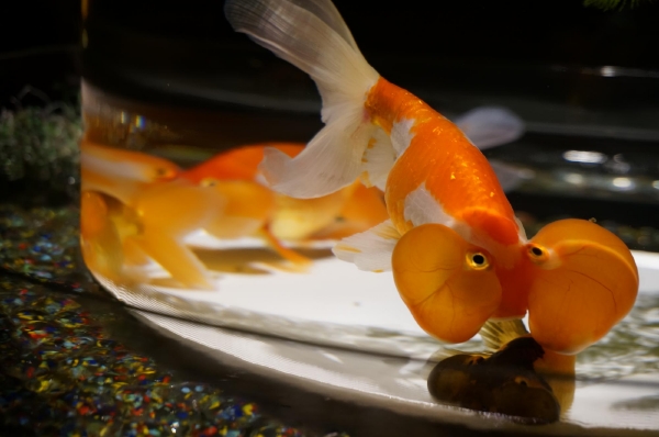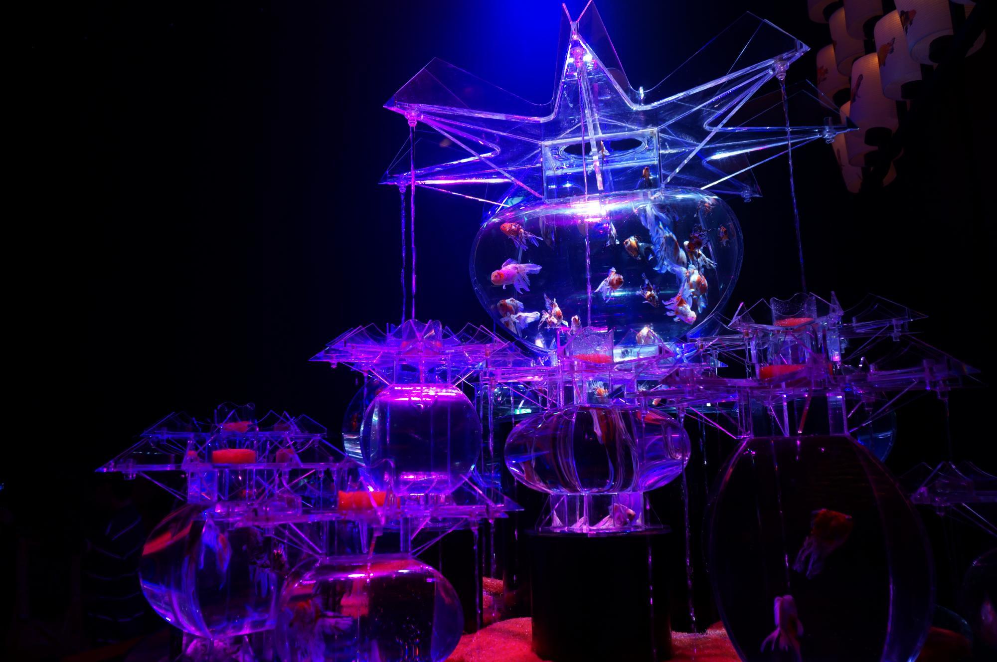光の屈折を意識した面白い水槽も多く、金魚なのに全く違うものに見えたり…。